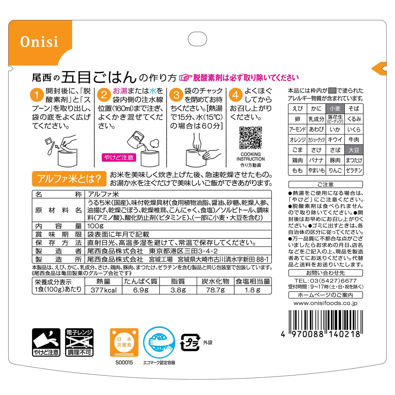 原材料:うるち米(国産)、味付乾燥具材(食用植物油脂、醤油、砂糖、乾燥人参、油揚げ、乾燥ごぼう、乾燥椎茸、こんにゃく、食塩)/ソルビトール、調味料(アミノ酸)、酸化防止剤(ビタミンE)、(一部に小麦・大豆を含む)