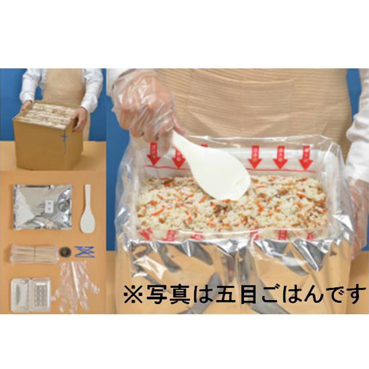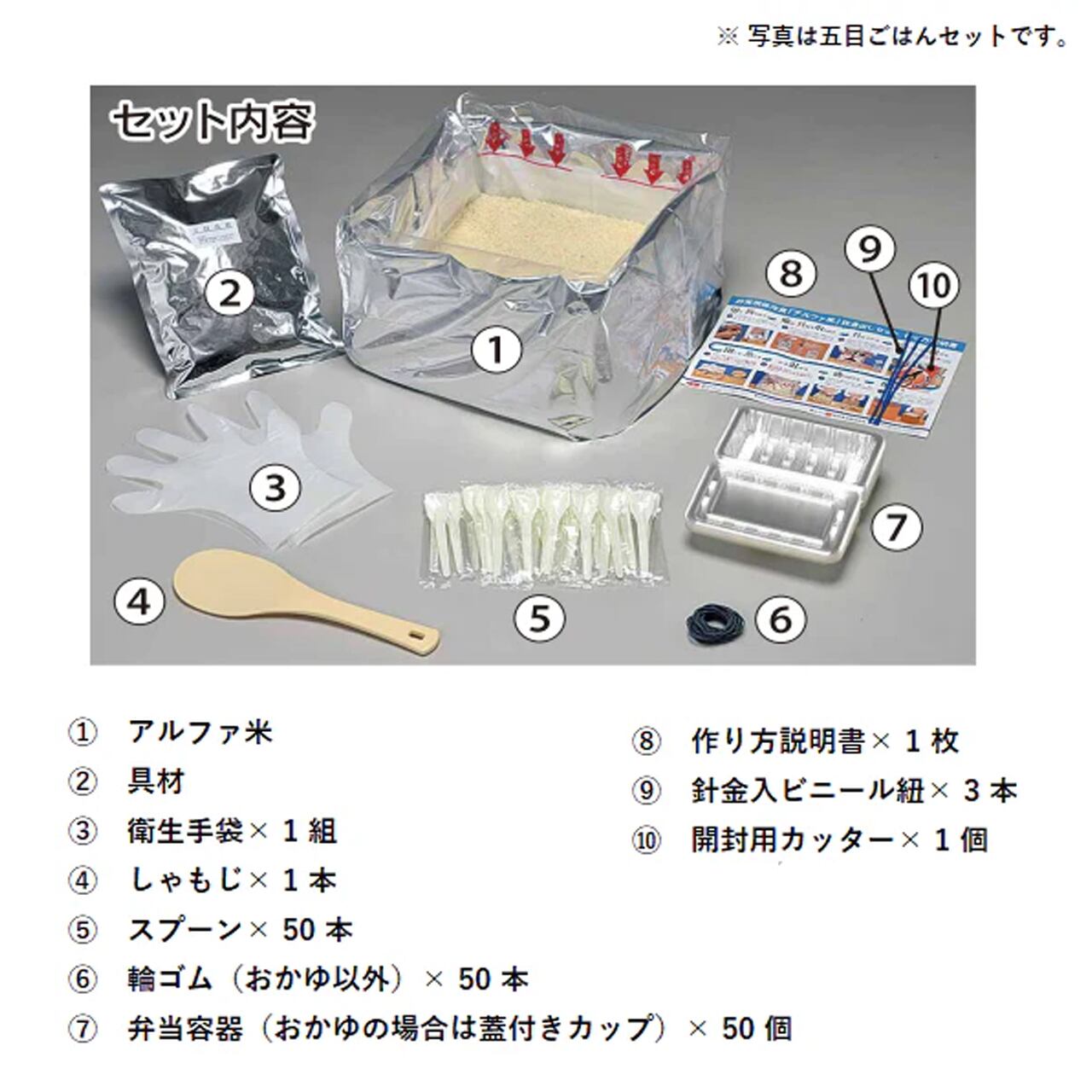 セット内容:アルファ米(5.0kg)、食塩50g×1包、梅しそふりかけ2.5g×50包、衛生手袋1組、しゃもじ1本、スプーン50本、輪ゴム50本、弁当容器50個、作り方説明書1枚、針金入りビニール紐3本、開封用カッター1枚