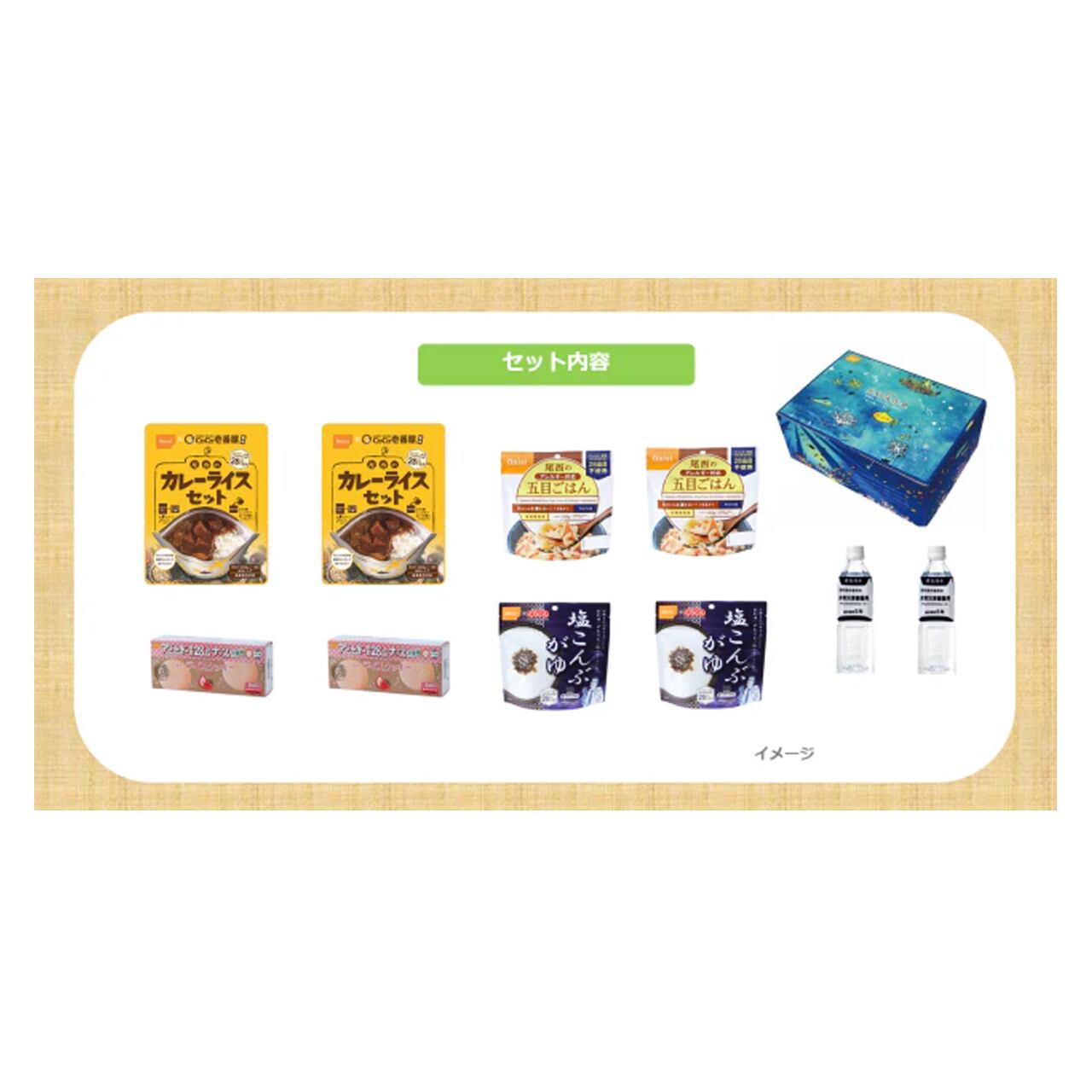 セット内容:尾西のアレルギー対応五目ごはん、尾西の塩こんぶがゆ各2袋、CoCo壱番屋監修 尾西のカレーライスセット2袋、 尾西のライスクッキー(いちご)2箱、 長期保存水(500mL×2本)、説明書