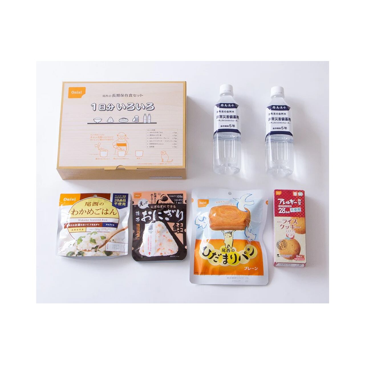 セット内容:尾西のわかめごはん1袋、尾西の携帯おにぎり(鮭)1袋、尾西のひだまりパン(プレーン)1袋、尾西のライスクッキー(ココナッツ)1箱、長期保存水(500mLx2本)、説明書