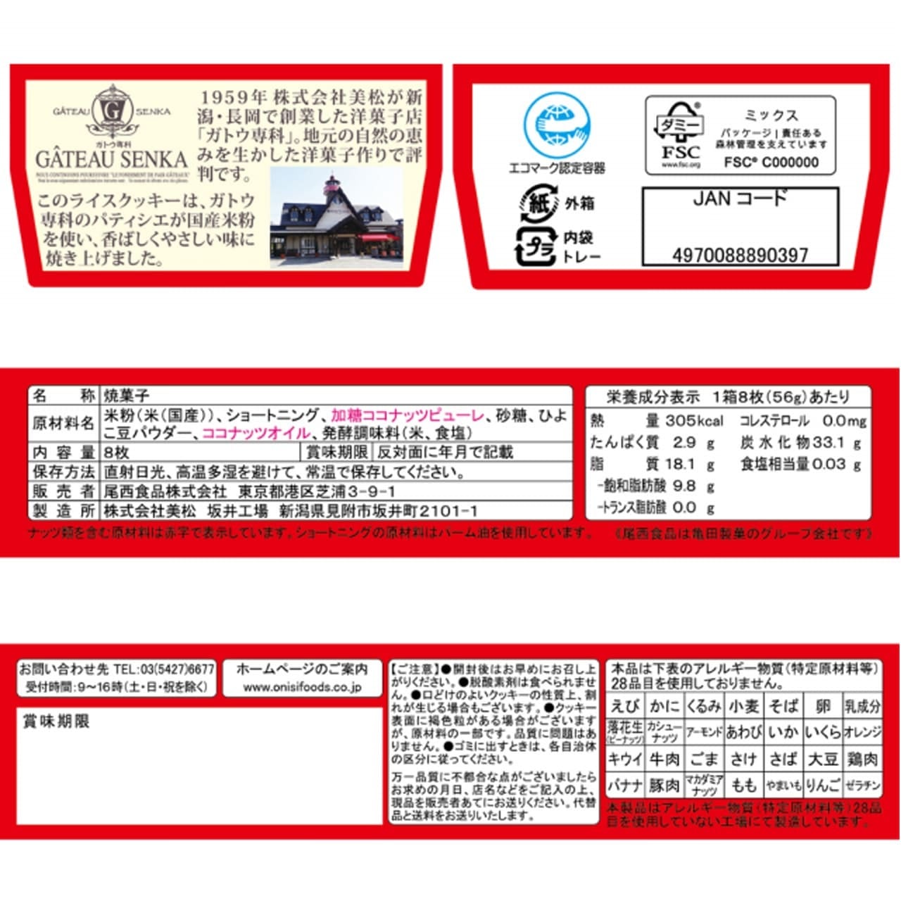 原材料:米粉(米(国産))、ショートニング、加糖ココナッツピューレ、砂糖、ひよこ豆パウダー、ココナッツオイル、発酵調味料(米、食塩)