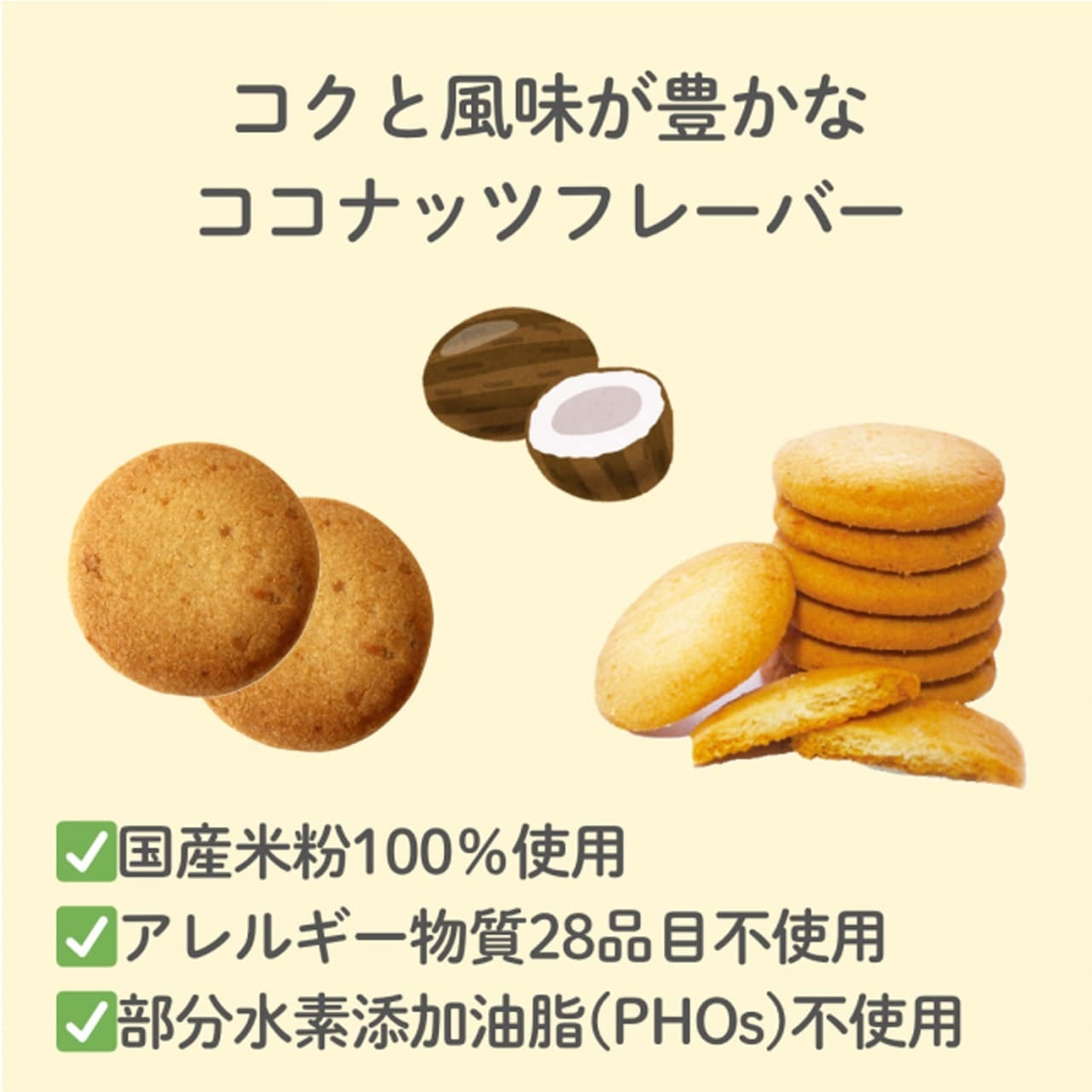 「小麦」「乳」「卵」不使用!コクと風味が豊かなココナッツフレーバー